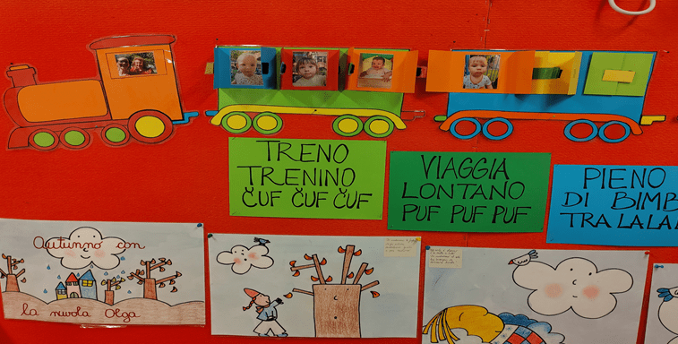 Noi siamo le Farfalline e siamo le piú piccoline. Con il trenino noi viaggiamo e ogni giorno cosí ci presentiamo. Con le manine ciao facciamo e cosí vi salutiamo e a tutti bacini mandiamo. Ogni giorno nuovi mondi esploriamo e nel nostro giardino giochiamo….