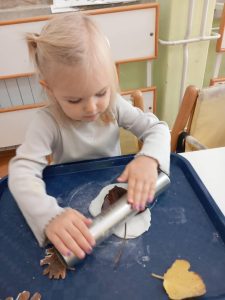 Ritornati in stanza i bambini hanno steso la pasta Das e sopra ci hanno appoggiato la loro foglia. Con l’aiuto del rullo hanno creato degli splendidi stampi che riproducono le loro venature e i loro contorni.