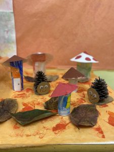 Con le meraviglie che la natura ci dona abbiamo creato splendidi quadretti che permettono alla luce di creare suggestive ombre sul pavimento e con delle pigne e un po’ di cartone abbiamo composto delle lumachine per il nostro “Bosco d’Autunno”.